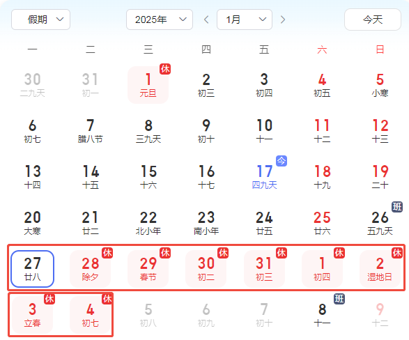 2025年1月27日 (星期一)至2月4日(星期二),放假時間為9天。1月26日(星期天)、2月8日星期六為調(diào)休時間公司正常上班。